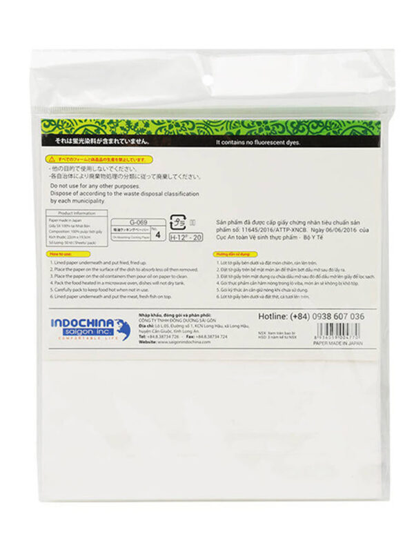 Sản phẩm giấy thấm dầu cao cấp số 1 tại Nhật Bản, giấy được hiệp hội giấy Nhật Bản công nhận công dụng tiếp xúc trực tiếp thực phẩm an toàn tuyệt đối. Sản phẩm được sử dụng rộng rãi và thường xuyên trong việc nấu ăn tại Nhật Bản và tại các nước phát triển.